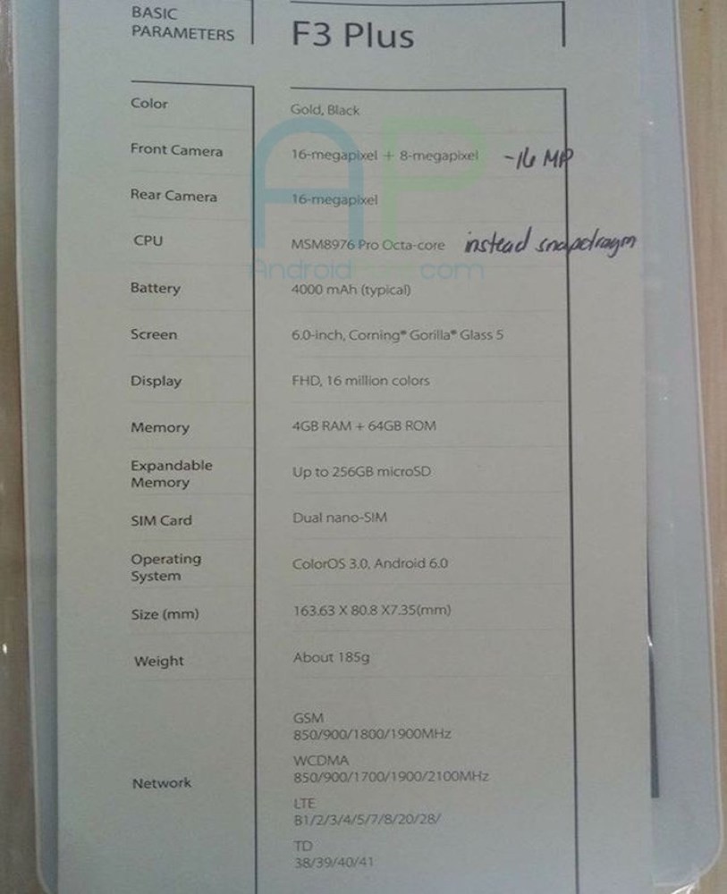 根據國外媒體報導指出,OPPO 預計在今年 3 月 23 日發表搭載雙自拍鏡頭的智慧型手機 F3 與 F3 Plus,其中 OPPO F3 Plus 的規格在近期曝光了,根據目前收到的資料顯示,OPPO F3 Plus 將搭載具備康寧第五代大猩猩玻璃的 6 吋 Full HD 螢幕、高通 Snapdragon 653 處理器、4GB RAM/64GB ROM 的記憶體與儲存空間,最高支援 256GB 記憶卡擴充以及支援雙卡雙待、內建 4000mAh 電池、運行 Android 6.0 作業系統與 ColorOS 3.0。而最受矚目的相機方面,OPPO F3 Plus 將採用 1600 萬畫素主鏡頭,以及 1600 萬畫素加上 800 萬畫素的雙自拍鏡頭,至於另外一款 OPPO F3,目前則是沒有任何資訊曝光,不過,從命名上來看,推測規格應該與 OPPO F3 Plus 差不多,最大的差異可能是螢幕尺寸而已。