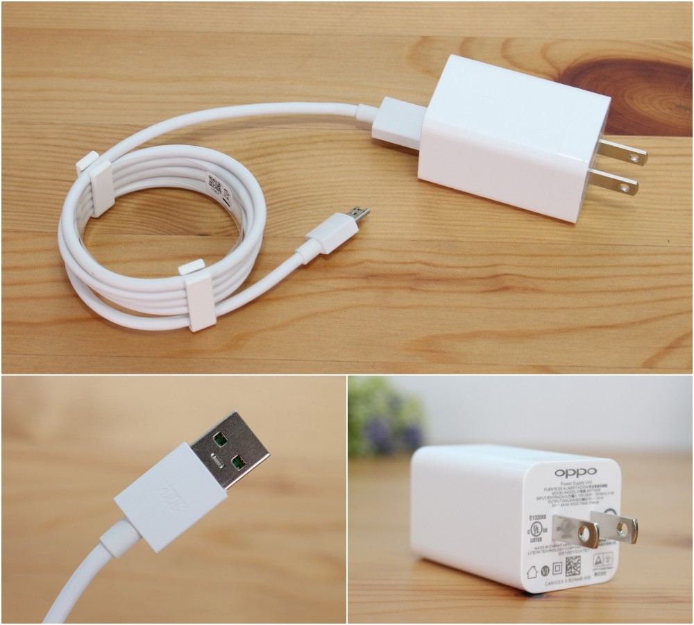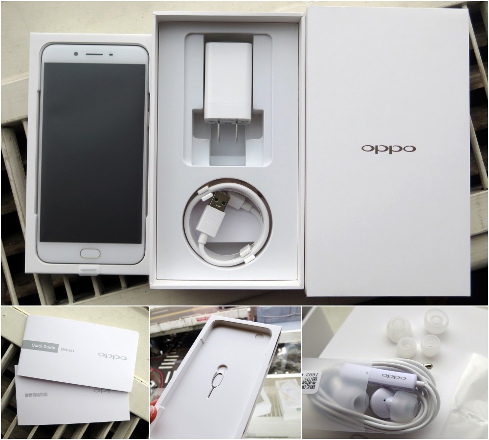 簡單整理一下裡面的東西,除了手機本體之外,下方壓著一根退卡針,而底下是 micro USB 連接線和 VOOC 閃充充電器。另外附上了保卡和資訊指南,最底下則是立體聲耳機和替換耳套。