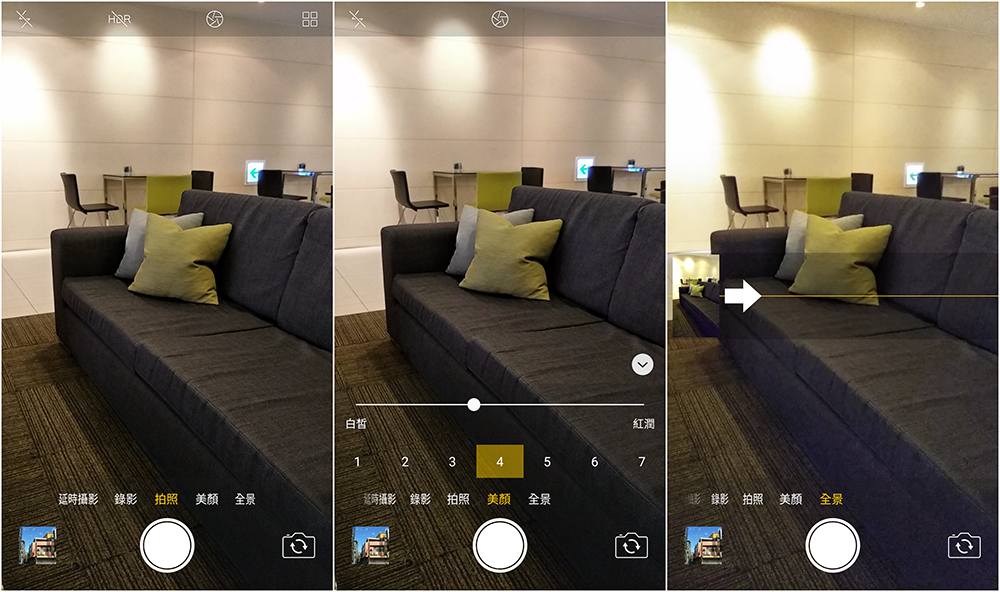 切換模式迅速,往左往右滑一下就可以切換延時攝影、錄影、拍照、美顏和全景。