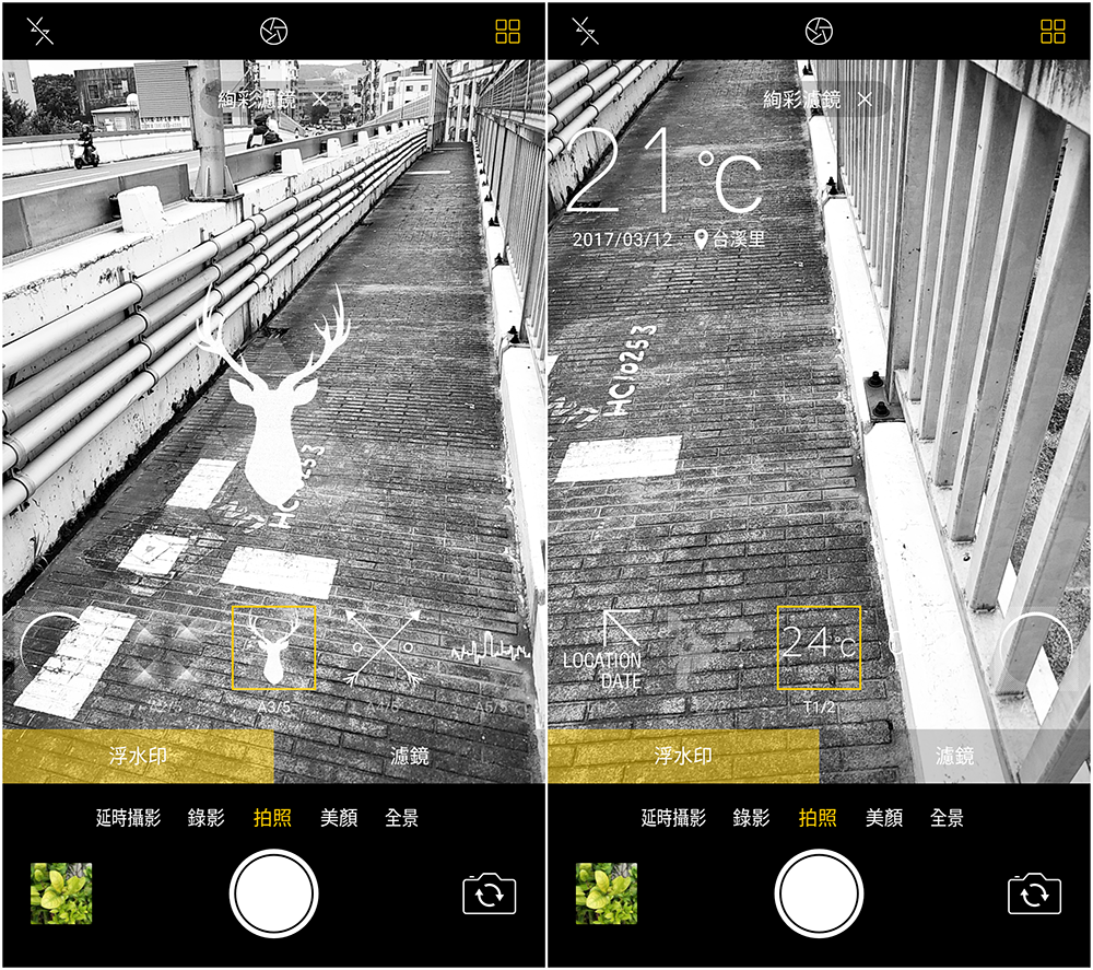 其實我們也可以加點小巧思,或更講究一點好好地利用各種拍照模式,像是套用特別的浮水印,可以顯示當下地點時間,上傳臉書或留著以後記錄都很不錯。