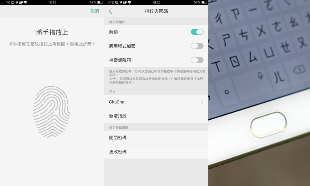 而且指紋解鎖是我目前用過最快的,真的是極速來著!幾乎是手指沾到就解鎖了,而前面提過的固態輕觸式指紋辨識解鎖,不用像其他手機那樣特別的去按壓辨識,我們還可以設定 5 組不同的指紋,是相當方便又安全的功能。