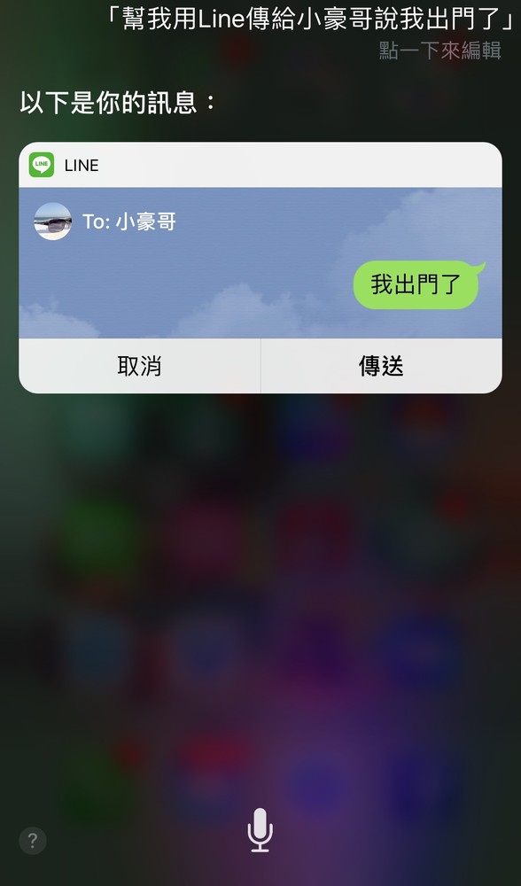 等到同意後,我們便能直接跟 siri 下達請他用 Line 來傳送給誰的指令,而沒讓人失望 siri 也的確為我們完成所有的指令。