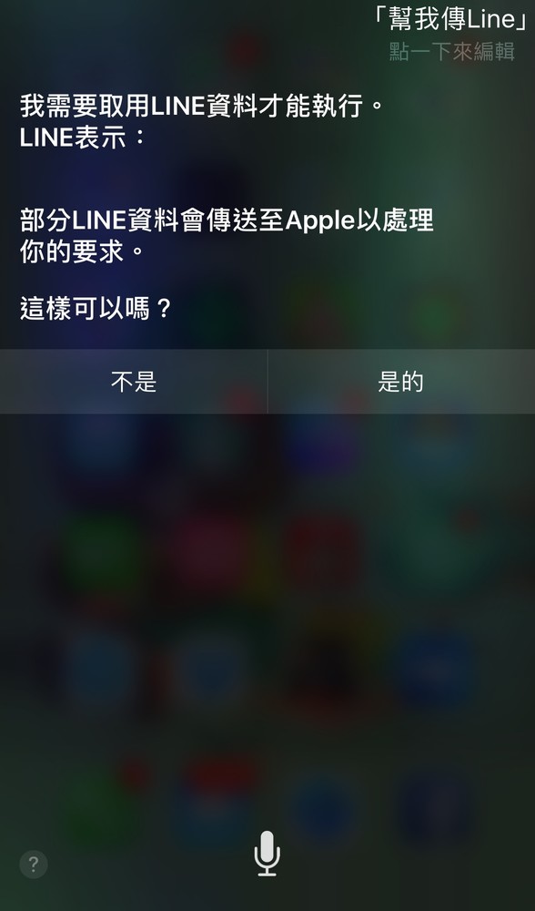 第一次透過 siri 來傳送 Line 的時候,siri 會先用相當親切的口吻徵詢你是否願意開放 Line 的權限給他。