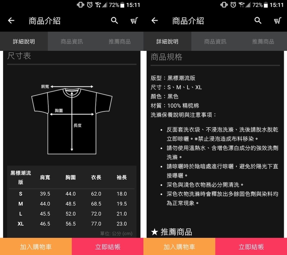 購買頁面下方還有商品的詳細說明、商品資訊以及推薦商品,若想了解欲購買的商品所有資訊,可以移動到購買頁面下方瀏覽一下。若決定購買此商品,可直接點擊右側的立即結帳進入結帳程序,如果決定購買此商品,但又想看看其他配件或是服飾,則是可以點擊左側的加入購物車,最後再從購物車中將所有購買的商品一次結帳。