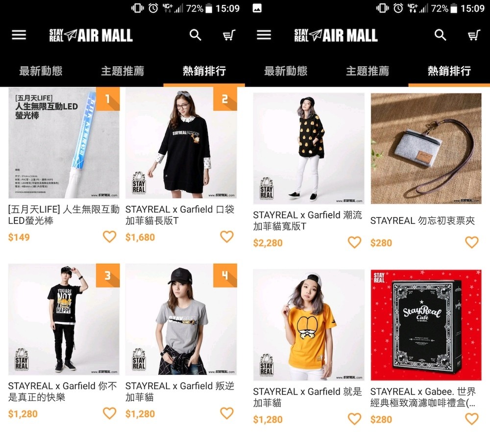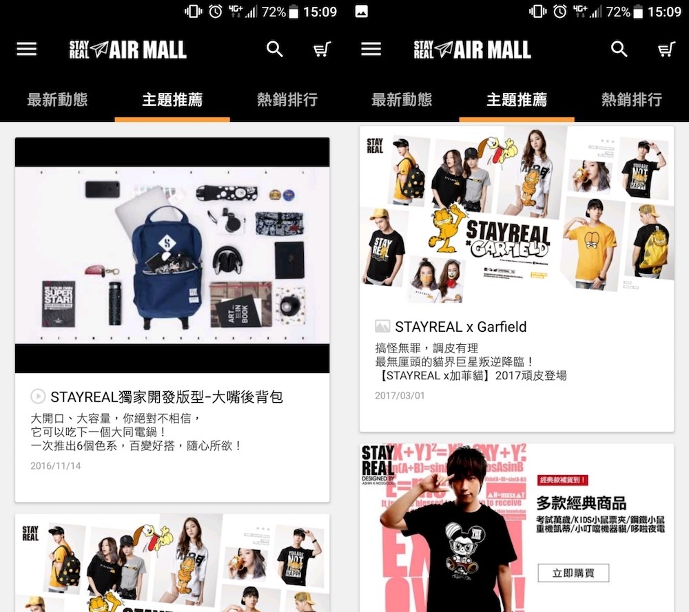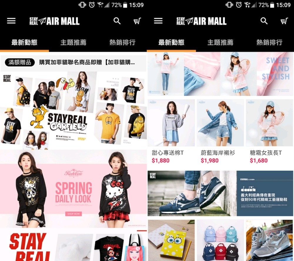 無論是 Android 手機還是 iPhone,只要事先到 Play 商店與 App Store 中下載 STAYREAL AIRMALL 行動商城,即可開始線上血拼。開啟 STAYREAL AIRMALL 行動商城後,會直接在首頁上看到三個分類,由左至右分別是提供消費者最新上架產品與潮流服飾資訊的「最新動態」、依照主題活動或是主題服飾分類的「主題推薦」,以及整理了整個 STAYREAL 熱銷產品的「熱銷排行」,消費者在購物前可以先瀏覽一下三個分類,再來選擇欲購物的商品。