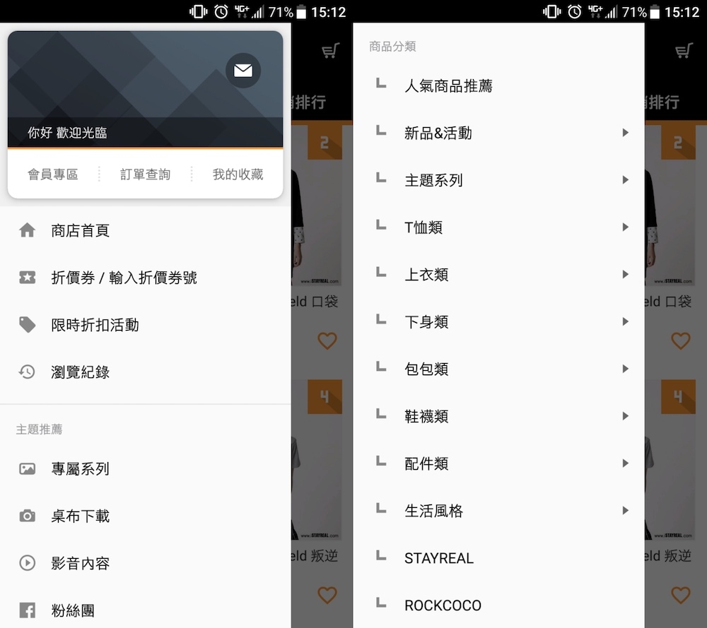 除了首頁上三個分類外,也可以依照透過左側側欄來瀏覽限時折扣活動、商品分類等內容,透過縮小搜尋範圍的方式,加快消費者在 STAYREAL AIRMALL 行動商城中搜尋商品的速度。