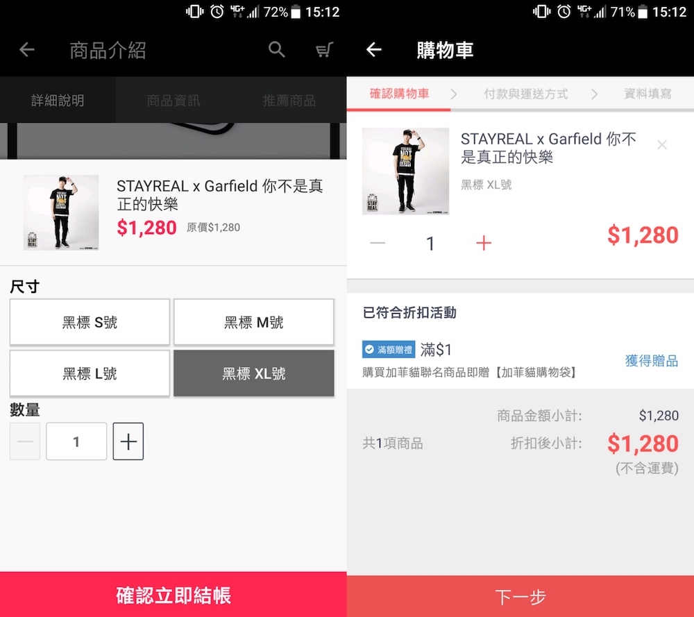 進入結帳頁面前,必須先決定好欲購買的商品數量、尺寸,接著系統才會進入結帳頁面,這時用戶只要依照 STAYREAL AIRMALL 行動商城的結帳程序輸入必要的資料與付款資訊,就能完成商品的購買流程,接著只要等 STAYREAL AIRMALL 行動商城將商品寄送到指定地址即可。