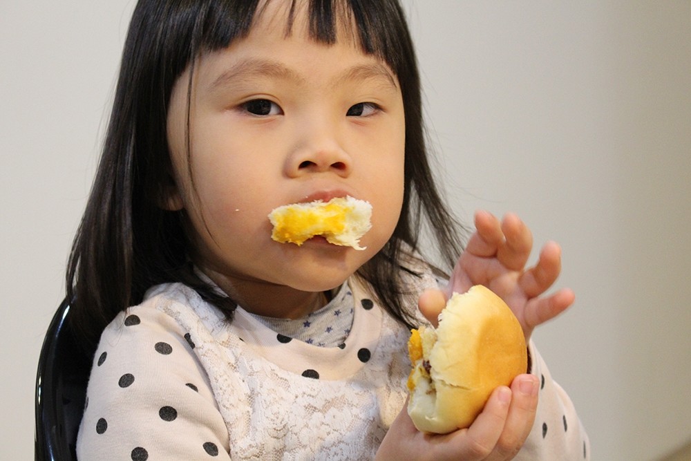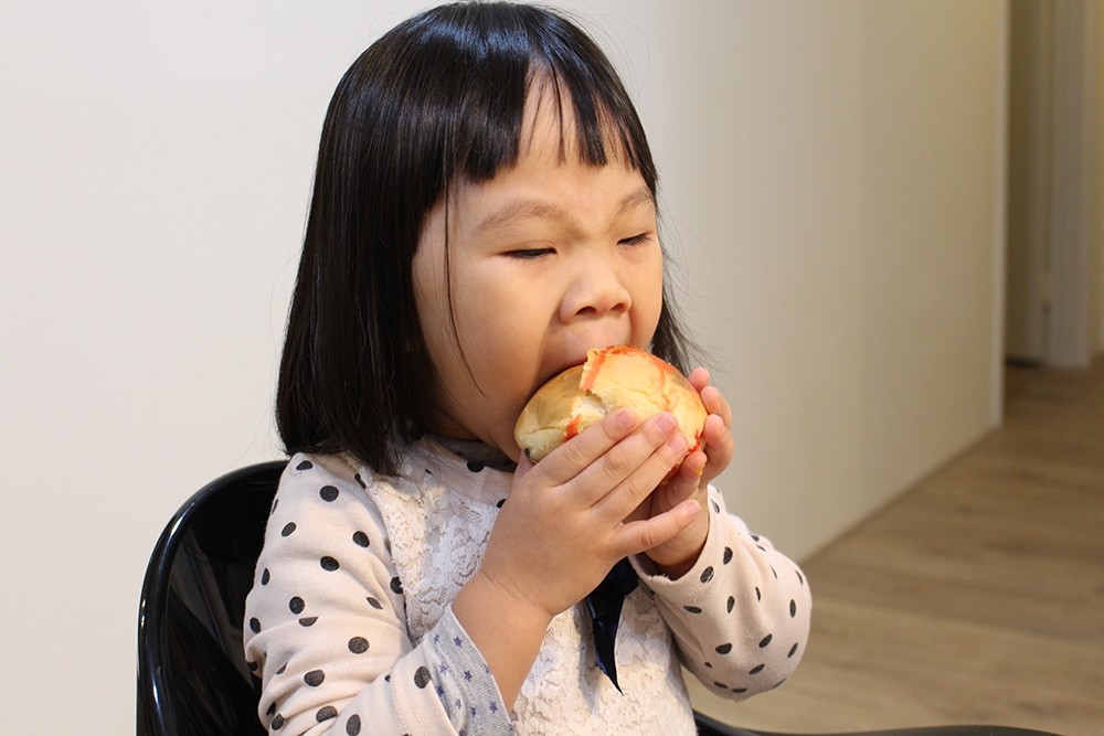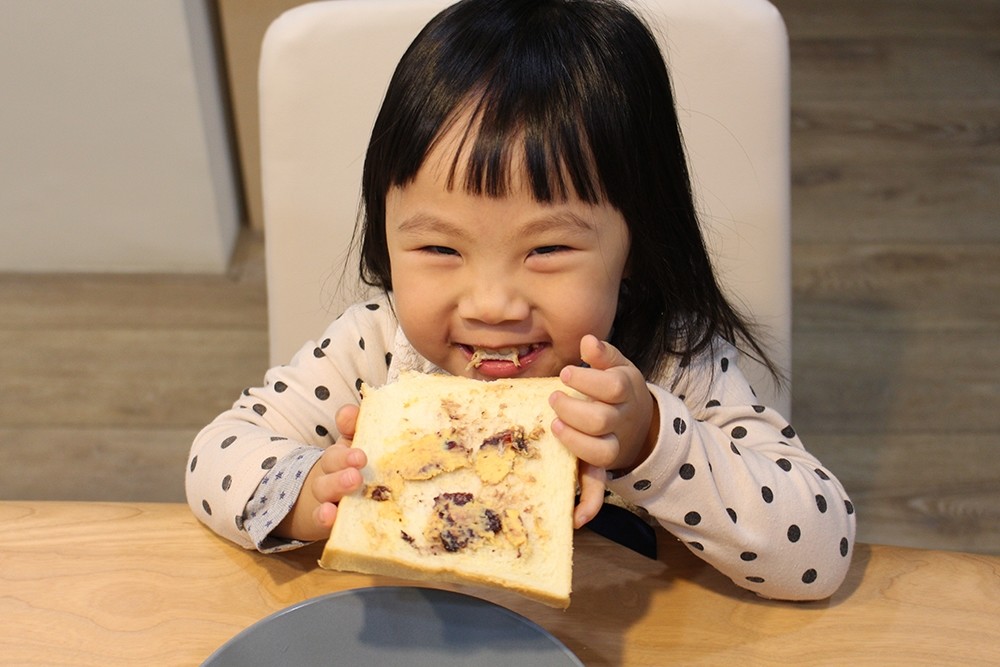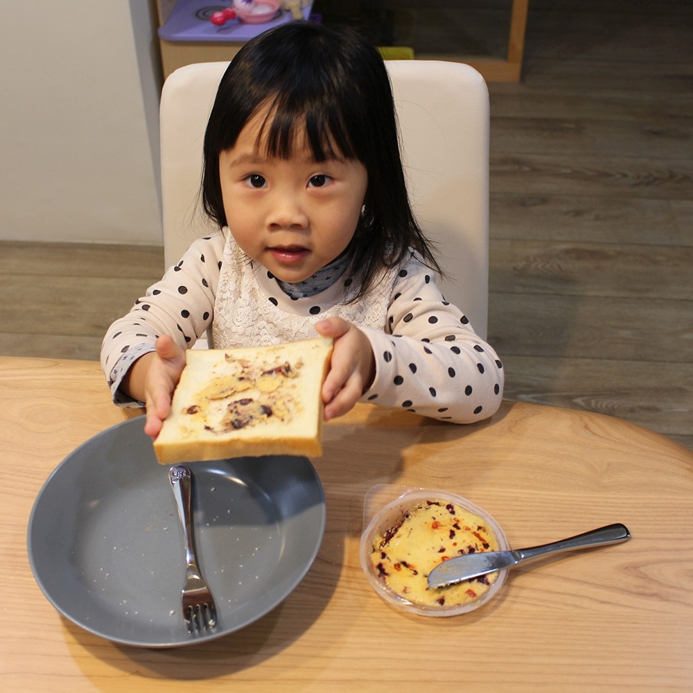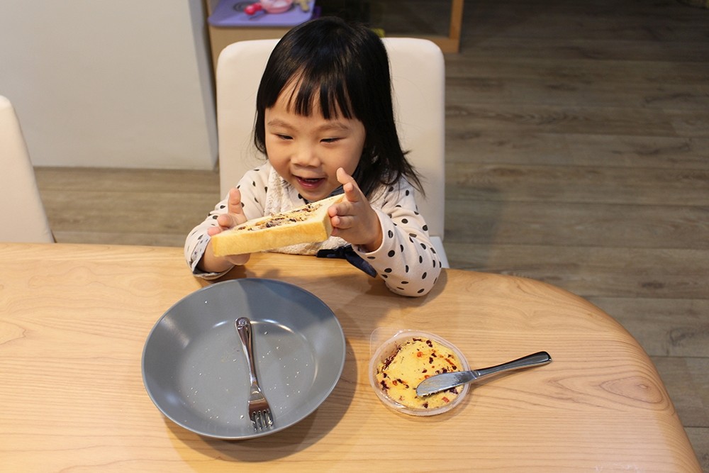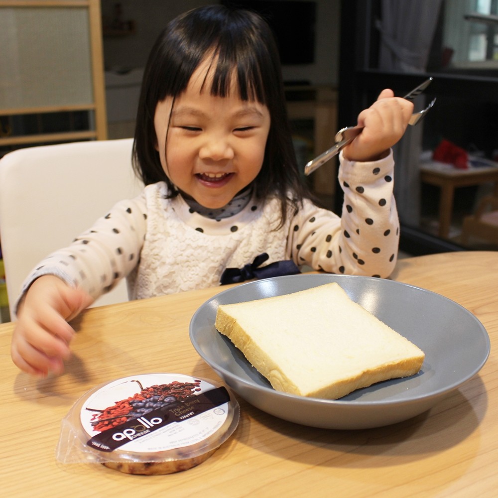 Apollo 莓果乾酪的特色是裡面有融入蔓越莓、藍莓以及養身的枸杞(也太會選了),結合香濃起司來夾麵包應該小朋友會很愛,而且吃起來超健康的啊!其實不管是什麼口味,只要搭配恰咪最喜歡的吐司她就超開心的了!