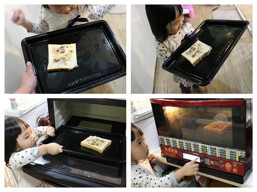 搞了一會兒才順利放在烤盤上(盤子都還沒擦乾就給我丟進來了),終於可以開始來烤吐司了~