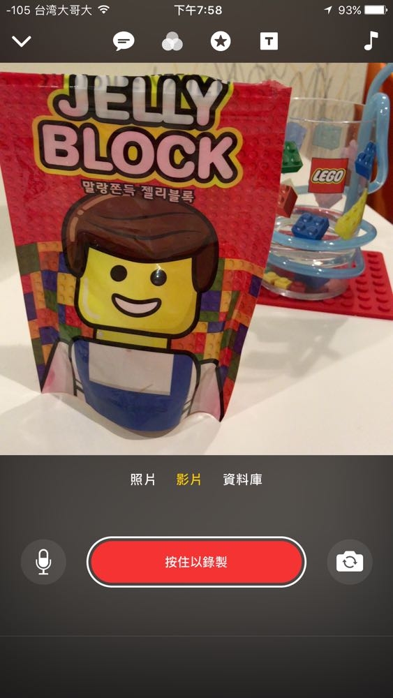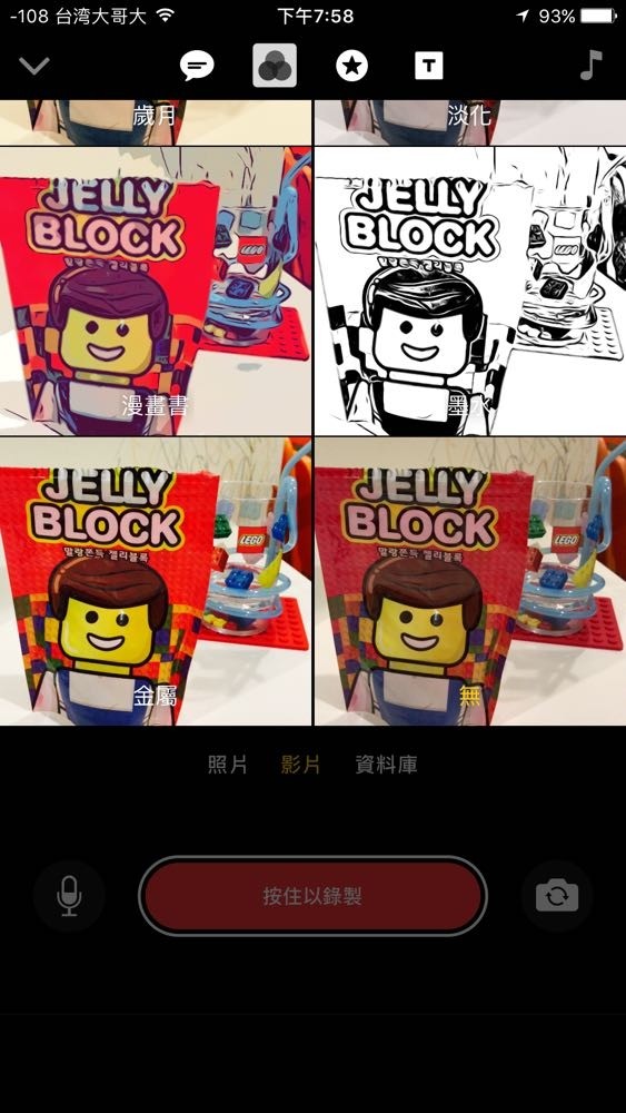 而我們能編修的地方也就一字排開的顯示在上方,由左至右分別是即時字幕、特效濾鏡、表情符號編輯文字四種。