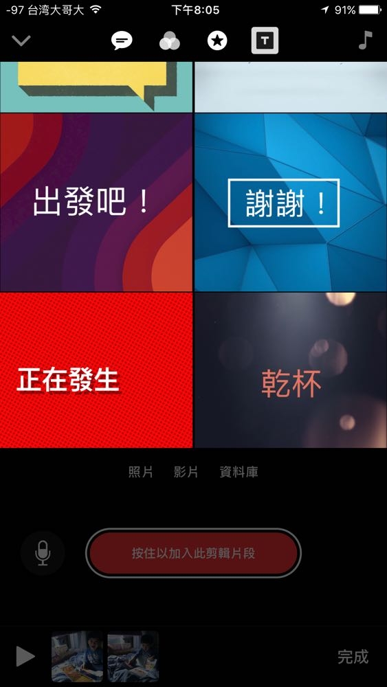 字幕部分無法使用在照片上,但濾鏡與貼圖沒有限制,而最後的文字則能當成過場或是封面封面來變化。