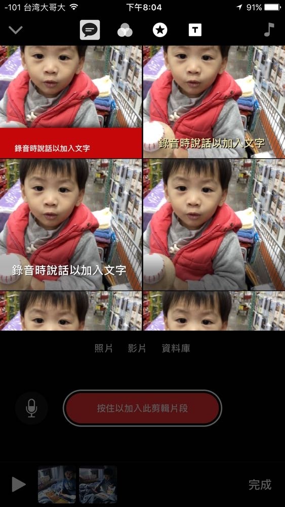 若是即時錄影的時候就能夠在邊錄邊說話來進行字幕顯示,若是使用資料庫的話,當影片進行到想要上字幕的地方時,只要按住中央紅色的「按住以錄製」按鈕就能開始說話。而一旁的麥克風按鈕,是讓我們來選擇要不要將聲音錄製進去的選擇。