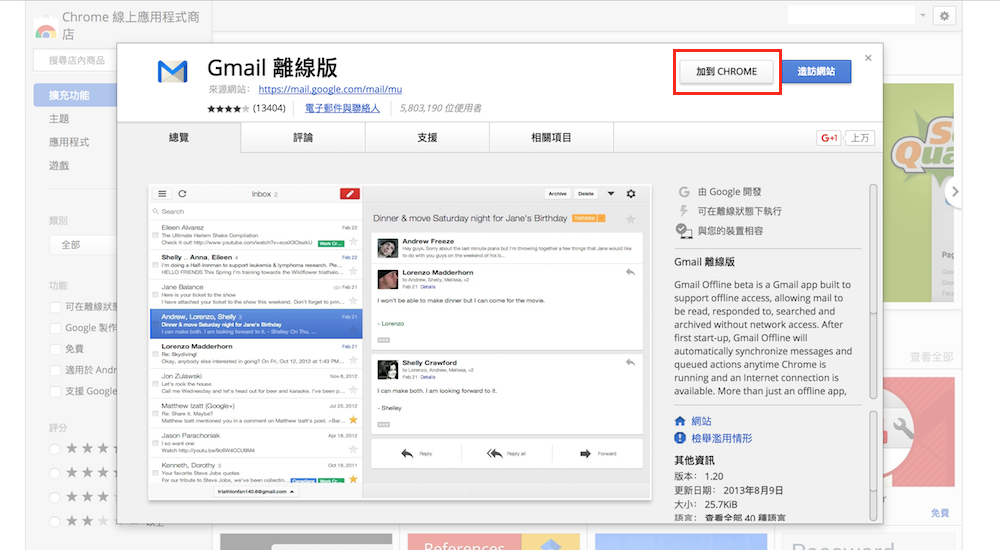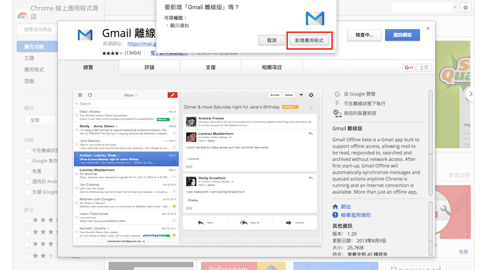 要在 Chrome 中新增 Gmail 離線版功能,首先,必須先進入 Chrome 線上應用程式商店搜尋「Gmail 離線版」App,或是直接點選 「Gmail 離線版頁面」連結,進入頁面後直接點選「加到 Chrome」,出現要新增「Gmail 離線版」時請點選新增應用程式,就可以完成下載安裝的動作。