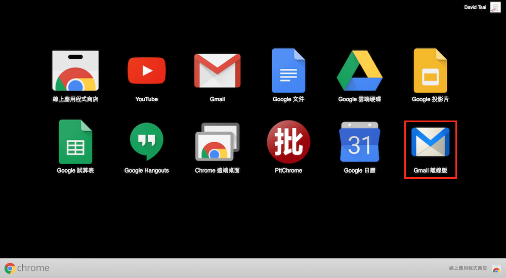 下載完成後,Gmail 離線版程式就會出現在 Chrome 應用程式頁面中,這時請大家點選 Gmail 離線版程式,進入後續的設定程序。