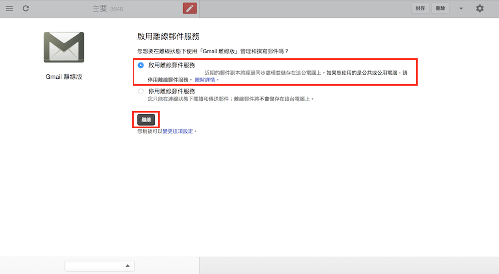 初次使用 Gmail 離線版,系統會要求用戶確認是否要啟用離線郵件服務,如果確定要使用 Gmail 離線版服務,請直接勾選上方的「啟用離線郵件服務」,並點選下方的繼續鍵完成啟用程序,相反的,若下載後不想啟用離線郵件服務,請直接勾選下方的「停用離線郵件服務」。