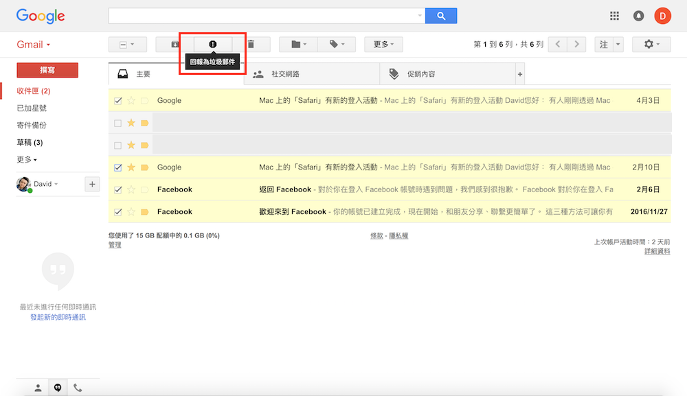 無論這些準備回報為垃圾郵件的數量是一封還是多封,標示完成後請直接點選上方工具列中的「回報為垃圾郵件」圖示,接著 Gmail 就會將這些會話群組視為垃圾郵件,若這個帳號未來還有寄送郵件過來,都將直接顯示於垃圾郵件收件匣中,再也不會出現於一般郵件的收件匣。