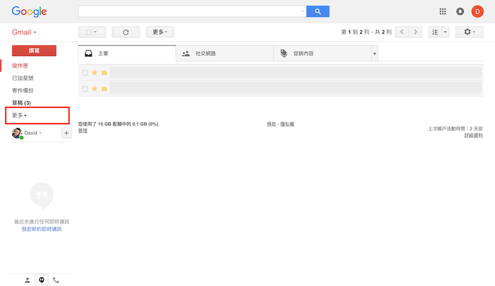 進入 Gmail 後,請直接點選左側的「更多」選項,就會跳出所有 Gmail 的功能,接著再點選「垃圾郵件」,就能馬上進入垃圾郵件的收件匣中。