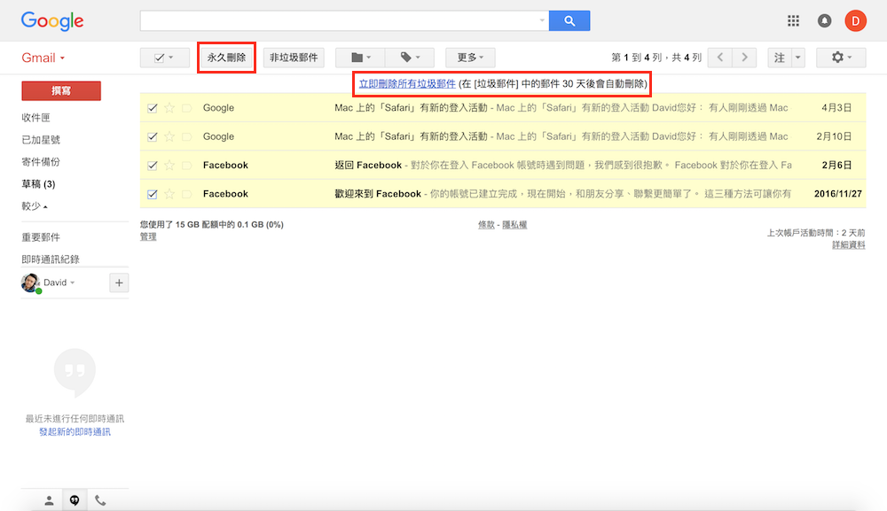 當進入垃圾郵件收件匣後,請直接將打算永久刪除的垃圾郵件勾選起來,接著只要點選畫面最上方出現的「立即永久刪除垃圾郵件」或是左上方工具列中的「永久刪除」,就能馬上將垃圾郵件收件匣中存放的垃圾郵件全部刪光光。不過,若用戶沒有手動將這些垃圾郵件刪除,Gmail 也僅會保存 30 天,30 天一到就會自動刪除。