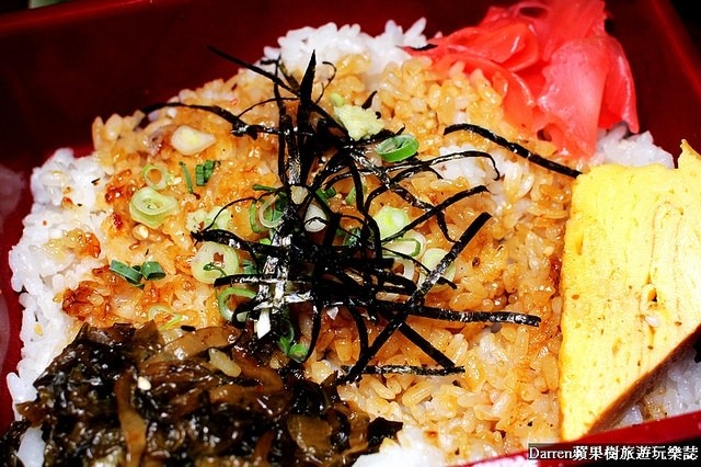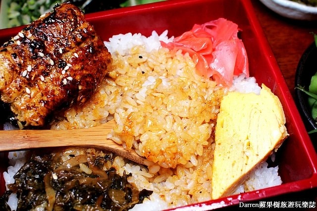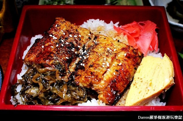 單人份的鰻魚飯現點現烤,端上桌鰻魚表免金黃油亮閃閃誘人,旁邊有玉子、醃蘿蔔、酸菜可以搭配
