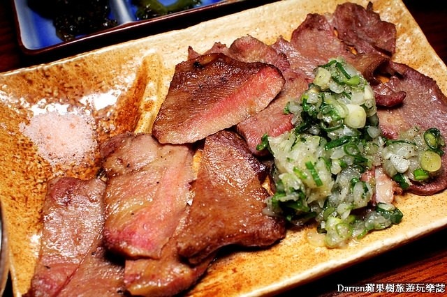 牛舌現點現烤口感軟脆多汁,可以搭配鹽蔥或玫瑰鹽,我喜歡配著鹽蔥入口蔥香和油脂香吃再多也不會膩