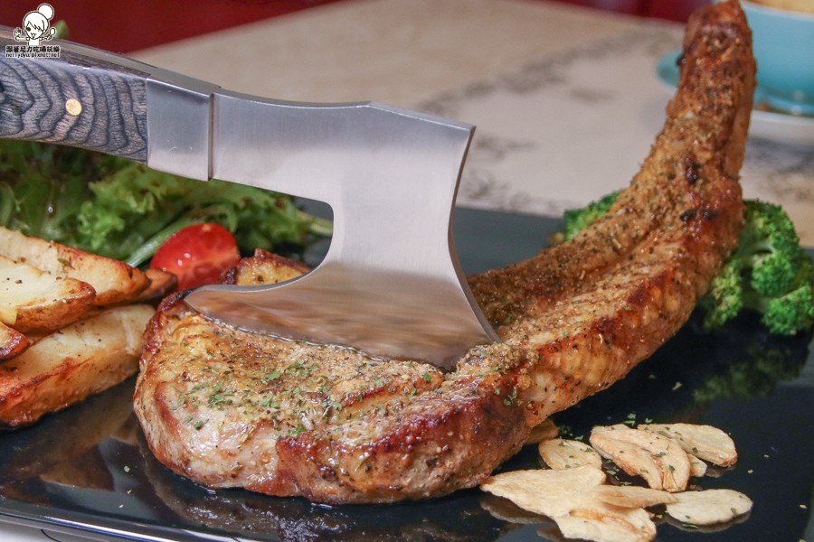視覺效果令人震撼到的戰斧豬排,哇!真的是一個小戰斧刀,是真的可以切肉的戰斧刀
