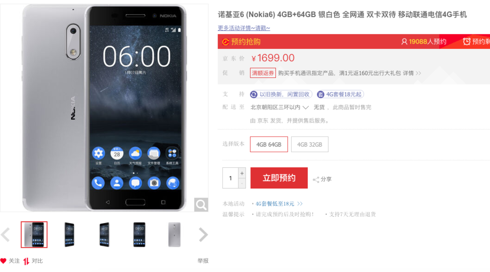 根據對岸京東網路通路的預購網頁顯示,Nokia 6 已經開放了銀白色的新色選擇,並且將於 4 月 11 日正式開賣。在規格方面與 Nokia 6 其他四色並沒有不同,依舊是提供了 4GB RAM 與 32GB / 64GB 兩種儲存空間,搭載 Android 7.0 原生作業系統與 5.5 吋 2.5D 雙曲面弧度螢幕。