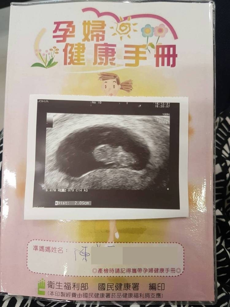 兩周後再度回到婦產科產檢,超音波已經可以聽到寶寶的心跳,每分鐘172下,今天也順利拿到媽媽手冊。