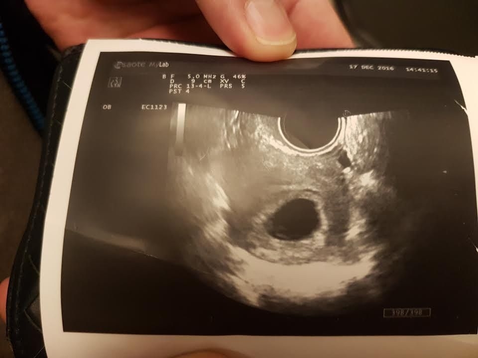 (照片是懷孕大概五周的陰道超音波,確定懷孕,且著床於子宮內,但超音波只照得到黑黑的胚胎)