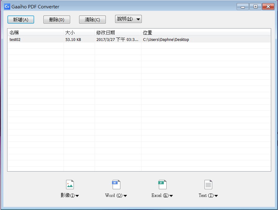 另外就是 Gaaiho PDF Converter 了,使用的方式很類似 Gaaiho PDF Driver,只需要把要轉換的 PDF 檔案拖曳到欄位中,接著在下方選擇要轉換成什麼檔案(影像、Word、Excel、Text),同樣最後點一下循環箭頭 Icon 就搞定了。