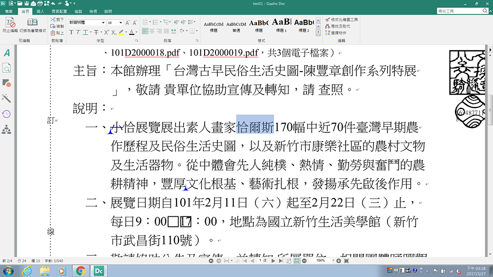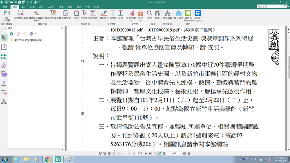 平常我們最怕就是文件一堆不好附件寄出,而且檔案又很大,藉由文電通轉換成 PDF,檔案大小整個大幅下降(尤其是圖片多的文件),在工作上真的有很大的幫助,客戶也一目瞭然。