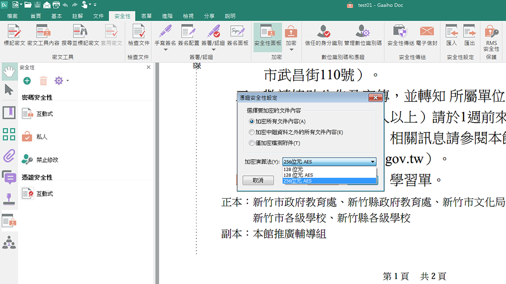 另外有的時候我們為了增加安全性,都會做一些文件加密的動作。這邊 Gaaiho Doc 支援了 128/256 位元的 AES 加密技術,藉由這樣的安全性傳送和相關權限密碼,除了保障文件安全之外,我們也能更有彈性的去限制開啟、瀏覽、複製、編輯或是列印的權限。