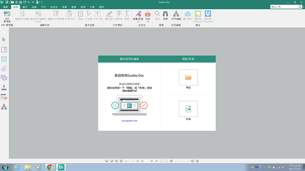 棣南「PDF文電通4專業版」的主要應用軟體 Gaaiho Doc,一打開就整個是熟悉的 Office 風格介面,讓我們很輕易就能產生 Office 相關產品設計的概念連結,完全沒有學習的進入性困難,一看就知道要從哪裡開啟、從哪裡做編修!