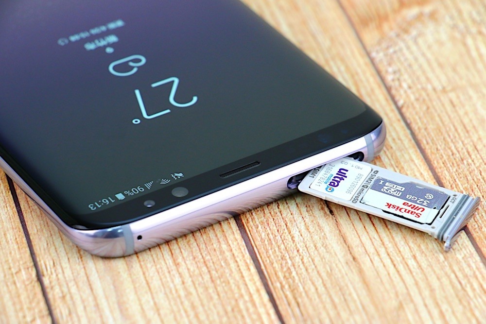 三星 Galaxy S8+ 的機身頂部,除了左側的降噪用麥克風之外,右側還設置了具備 4G+ 3G 雙卡雙待的三選二卡槽,若用戶沒有雙卡雙待的需求,則可以將 SIM 卡 2 換成 microSD 記憶卡,最高支援 256GB 擴充。