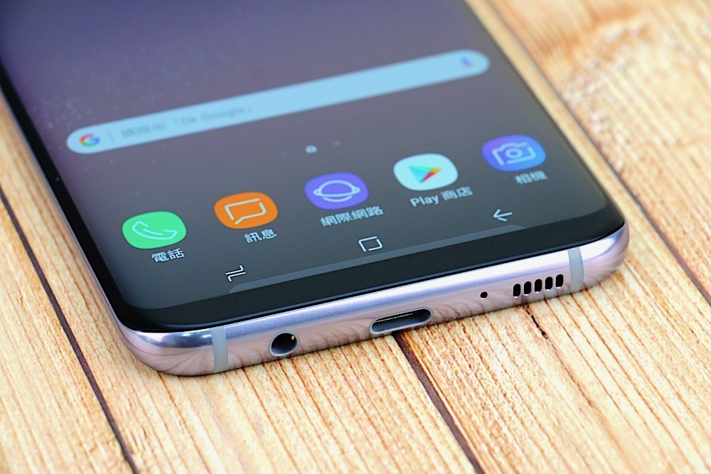 三星 Galaxy S8+ 的機身底部,由左至右則是 3.5mm 耳機孔、USB Type-C 連接埠、麥克風、揚聲器。