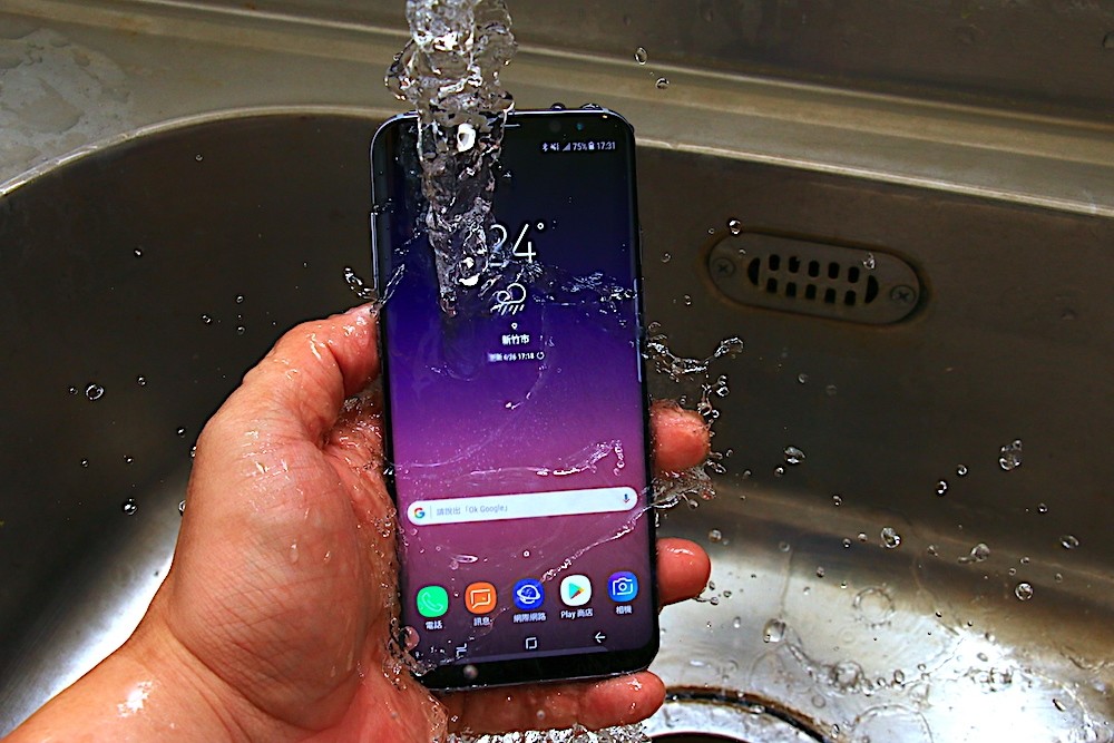 三星 Galaxy S8+ 同樣具備 IP68 防塵防水技術,據官方數據表示,Galaxy S8+ 不僅能抵抗一般清水、雨水的潑濺,更可以浸泡在 1.5 公尺之內的清水中長達 30 分鐘之久,即使手機不小心潑到水、淋到雨,或是帶到泳池邊使用,也不用擔心手機會因此受到傷害。不過,要特別注意的是,IP68 防塵防水僅限於一般清水,建議不要接觸到溫泉水、海水、熱水,以免防水膠條受損造成防水失效。
