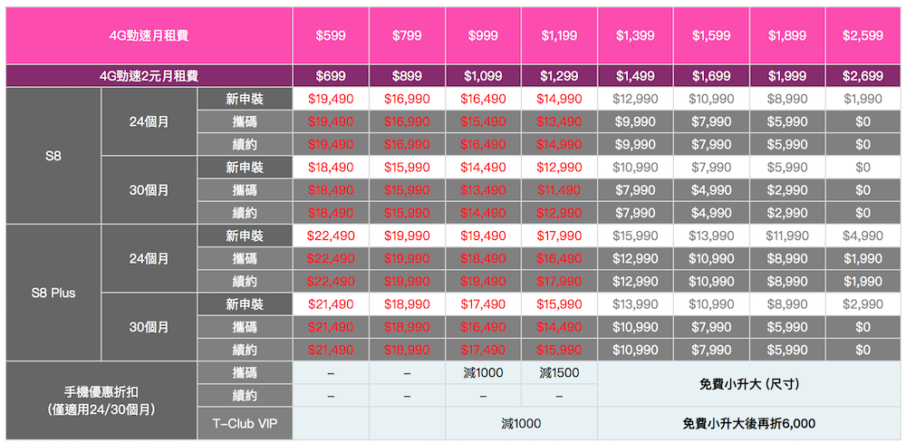 今年上半年最受各界矚目的三星旗艦機款 Samsung S8、S8+,即將於 5/1 在台灣正式上市,而台灣之星近期也搶先宣布 Samsung S8、S8+的資費方案,不僅針對新申辦/攜碼/續約搭配 4G 勁速資費的用戶推出月租費降價的方案,就連到實體門市申辦月租 $799,或是於網路門市申辦月租 $599 起的方案,也有不少的優惠。此外,台灣之星甚至還領先業界推出續約/攜碼 1,399 以上月租費的用戶,還可再加碼享業界唯一尺寸「免費小升大」優惠,讓用戶可以免費將 S8 直接升級為 S8+帶回家。
