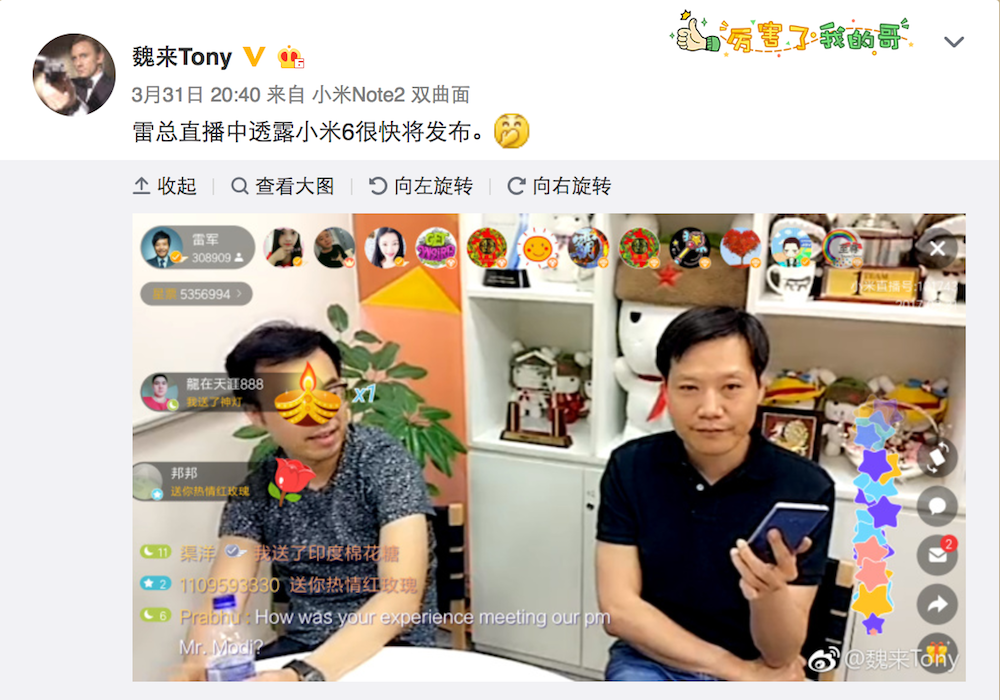 根據小米官方人士 Tony 在個人微博上的貼文來看,小米科技創始人雷軍在近日與網友互動的直播中透露,外界引頸期盼的小米 6,預計在今年 4 月就會正式亮相,雖然雷軍並沒有透露是 4 月的哪一天,但從雷軍的反應來看,距離發表會的到來應該不遠了。此外,也有網友猜測小米 6 為何會這麼晚才亮相的原因,對此,雷軍並沒有正面回應,但從小米 6 將會採用的高通 Snapdragon 835 處理器來看,很有可能是初期供貨的問題才導致小米 6 延後發表,不過,也不排除新機造機手法太過困難,導致上市時間延後的可能。