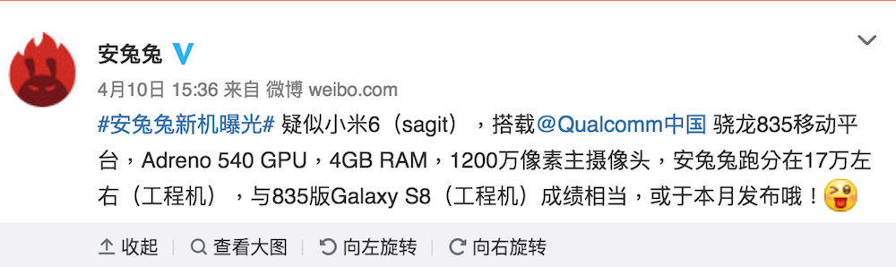 小米6黑科技再現 跑分成績現身安兔兔資料庫 將在4月19正式發表