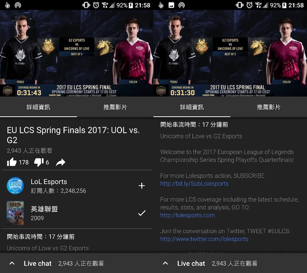 而進入實況畫面之後,除了最上方的實況畫面之外,觀眾也可以在下方的詳細資訊中了解目前進行遊戲實況的聯賽、職業選手、實況主、業餘玩家的個人資訊與詳細介紹,若喜歡也可以訂閱該頻道。