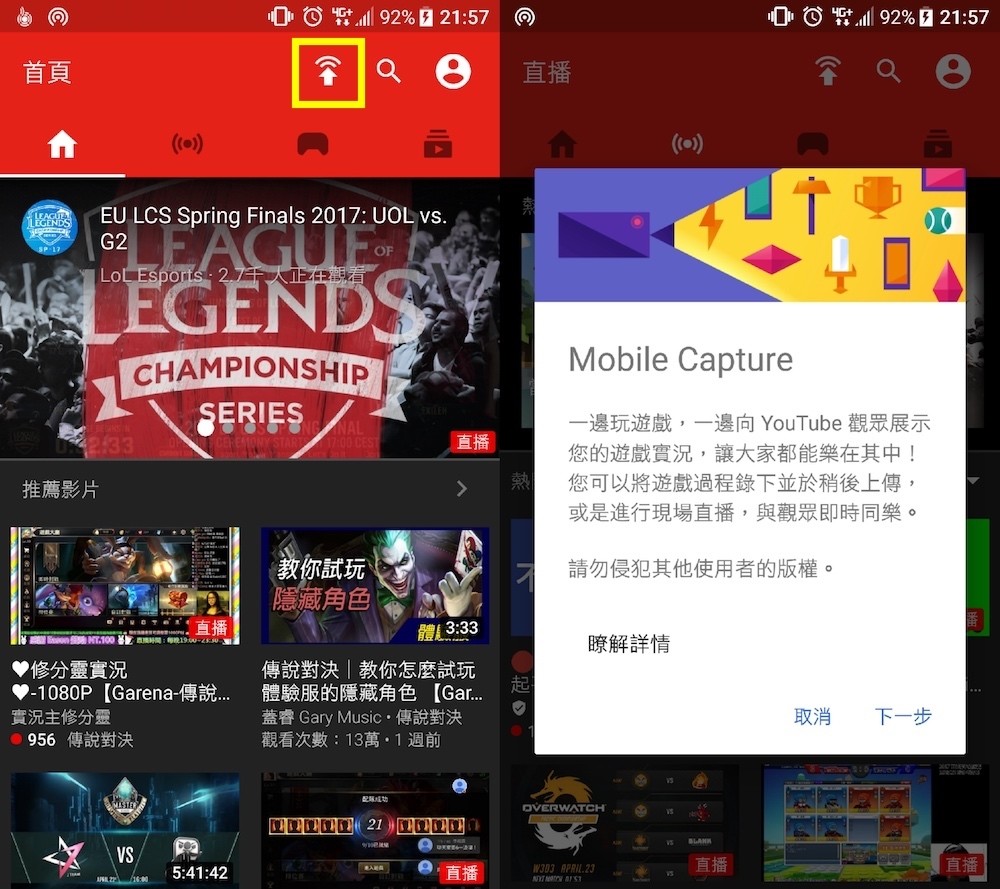 若覺得自己的電腦遊戲、手機遊戲玩得非常出色,且對遊戲的理解程度有如職業電競選手、遊戲實況主,也可以透過右上角的直播上傳功能,將自己的遊戲畫面與實況過程上傳至 YouTube Gaming,讓全球的觀眾都能觀賞自己遊戲的精湛操作。