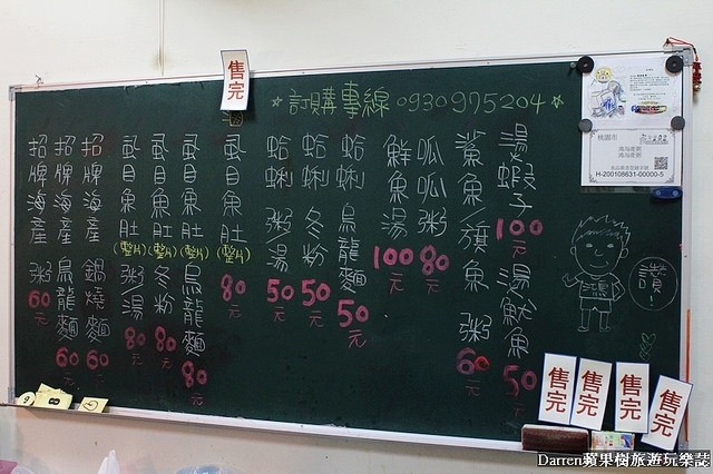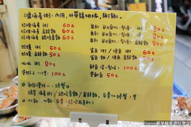 鴻海產粥的MENU點單,粥類大多是50~80元,加飯加麵免費,如果是螃蟹日因為螃蟹太大就有無法加飯加麵