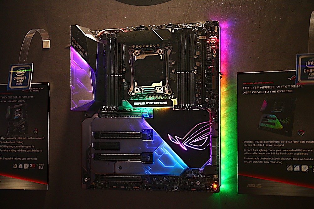 除了常見的週邊配件具有 ASUS Aura Sync 同步燈效技術外,今天才剛亮相且支援新款 X299 晶片組的 ROG Rampage VI Extreme 與 ROG Rampage VI Apex…等高階主機板也具備 ASUS Aura Sync 同步燈效技術,若搭配同樣具有 ASUS Aura Sync 同步燈效技術的顯示卡、Pugio、Strix Fusion、Poseidon GTX 1080 Ti、Swift PG27VQ、SLI HB Bridge、GR8 II…等產品一起使用,再加上透明主機外殼,立馬讓主機成為最酷炫、最具電競氣息的配備。