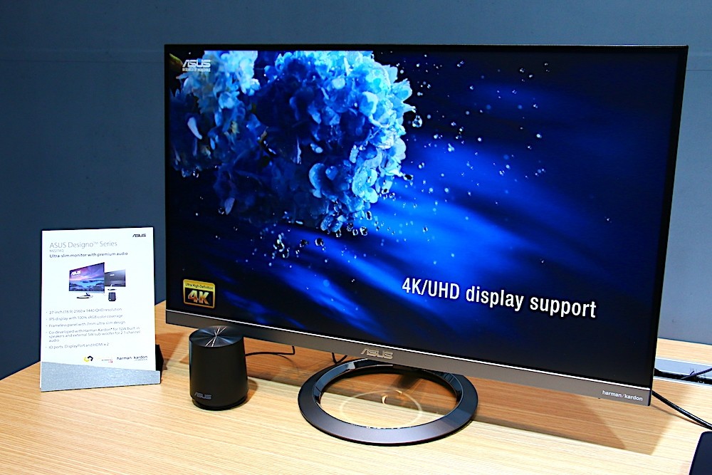 而 ASUS Designo MZ27AQ 顯示器,則是一款 27 吋 WQHD (2560 X 1440) IPS 無邊框螢幕,並具備 100% sRGB 超廣色域,機身最薄處僅有 7mm,並配有 DisplayPort 與兩個 HDMI 連接埠,並內建 12W 立體聲喇叭與獨立 5W 重低音喇叭,可提供 2.1 聲道音效,搭配內建的 harman/kardon 音效技術,足以營造出劇院級的影音體驗。此外 ASUS Designo MZ27AQ 顯示器還具有日晷金屬底座設計,不僅造型好看更能有效提高螢幕放置在桌上的穩定度。