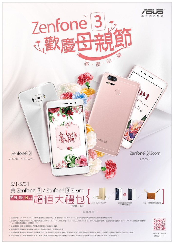 特別注意的是,ZenFone 3歡慶母親節感恩回饋」活動必須是即日起至 5 月 31 日前購買「ASUS ZenFone 3 (ZE552KL / ZE520KL)」,或是「ASUS ZenFone 3 Zoom (ZE553KL)」,並在 6 月 7 日前上網登錄的朋友才能享有,且各項贈品數量有限,送完為止,要趁母親節孝敬一下媽媽的朋友,要買要快。