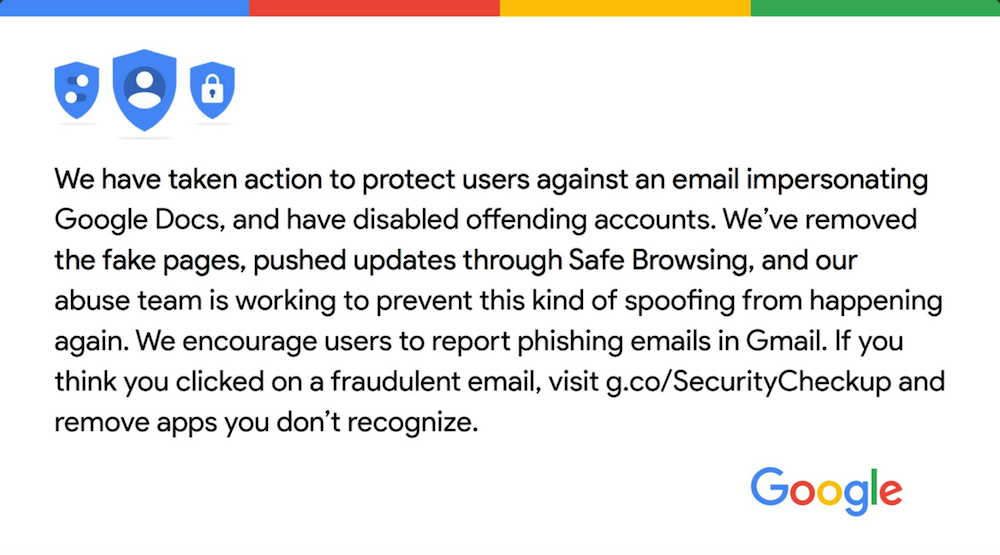 針對近期不少用戶受到 Google Docs 文件檔案的傷害,Google 母公司 Alphabet 也正式對用戶發出警告,要所有用戶特別留意朋友或是公司同事寄來的每一封電子郵件,確定內容無誤再做點擊的動作,才能避免自己也受到傷害。此外,Google 也對外表示,目前正透過封鎖違規帳號和移除惡意頁面的方式來阻止盜用事件發生,誓言保護所有 Google 用戶的帳戶安全與權益。