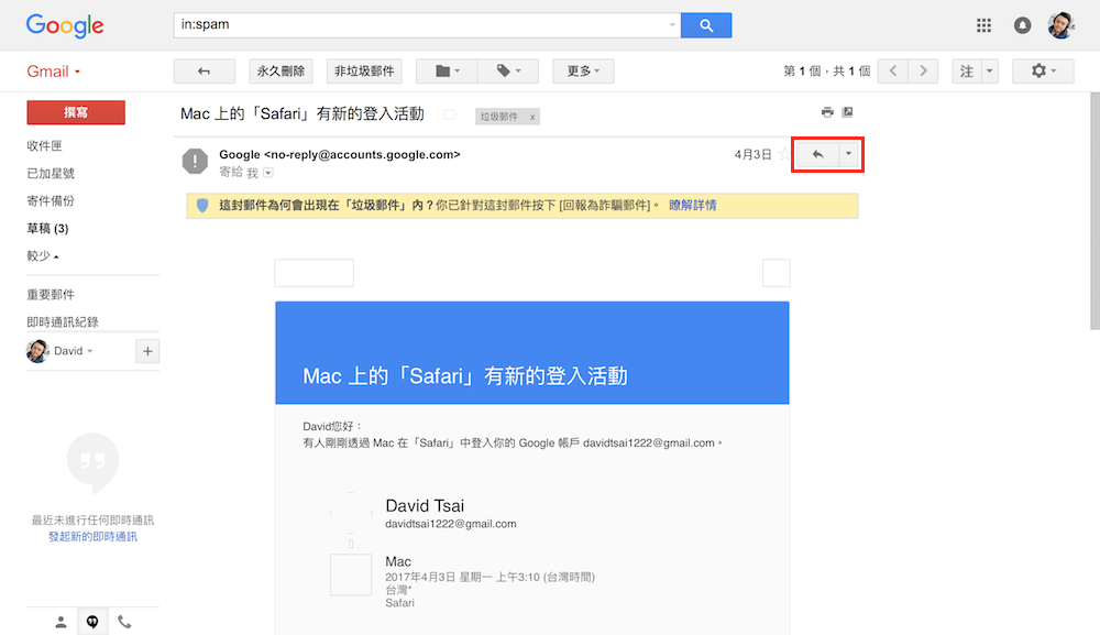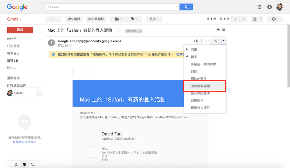 第一步 – 開啟 Gmail,點選被誤標為詐騙郵件的郵件