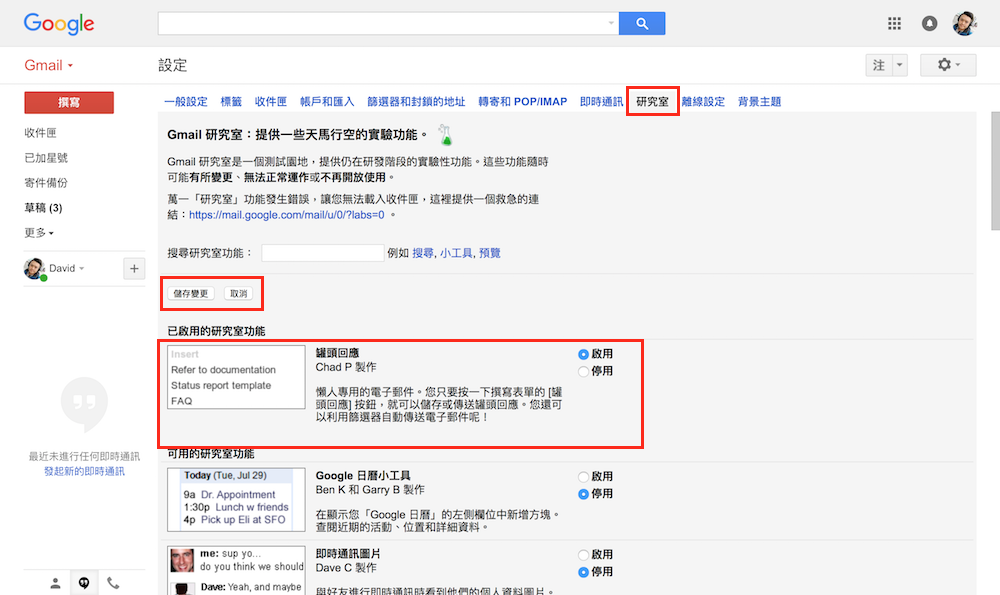進入 Gmail 設定頁面後,請直接點選上方的「研究室」功能,接著找到研究室中的「罐頭回應」,勾選啟用後再移動到畫面的最上方或最下方,點選「儲存變更」即可完成設定。