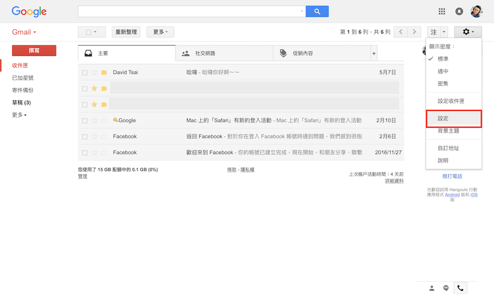 要啟用 Gmail 的罐頭郵件功能前,首先必須使用電腦的網頁瀏覽器開啟 Gmail,接著點選右上角的齒輪圖示,並選擇其中的「設定」選項,這時就會立刻進入 Gmail 的設定頁面。