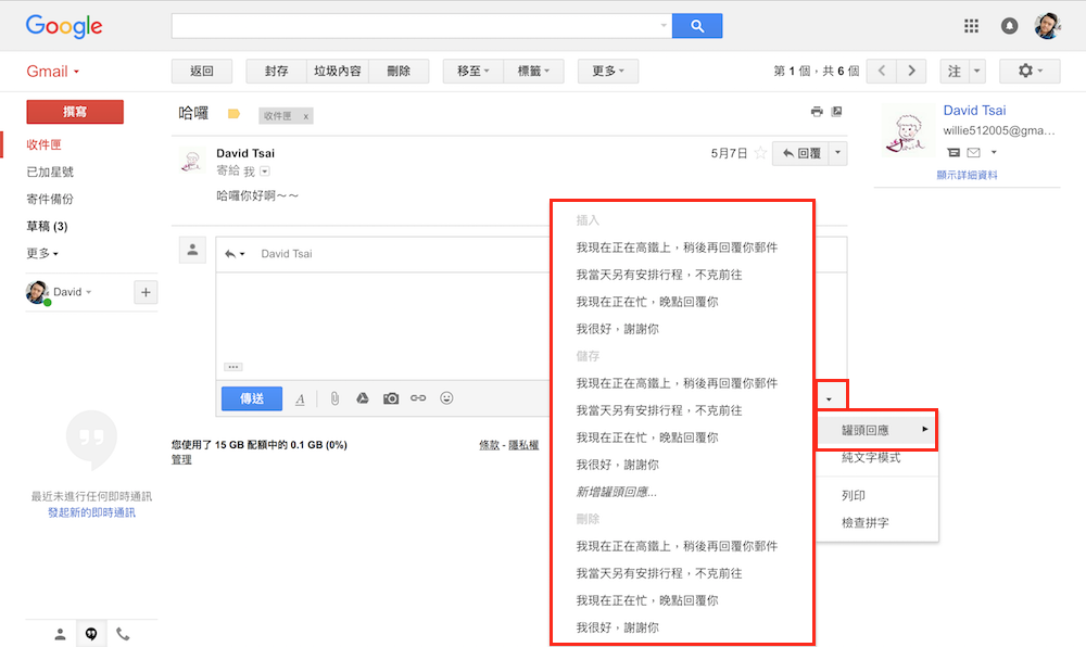 「罐頭回應」功能,是個能讓用戶在最短的時間內回覆寄件者的方法之一,因這個功能被隱藏在 Gmail 研究室中,所以不少用戶都不曉得原來 Gmail 有提供這麼快速回覆郵件的功能。不過,啟用「罐頭回應」後不代表馬上就有多種可以快速回應對方的罐頭訊息可用,必須自己手動新增需要的罐頭訊息才能快速回應,雖然某些程度來說有點小小的不便,但能讓用戶依照個人需求的客製化設計,也算是給予用戶最高的使用自由。