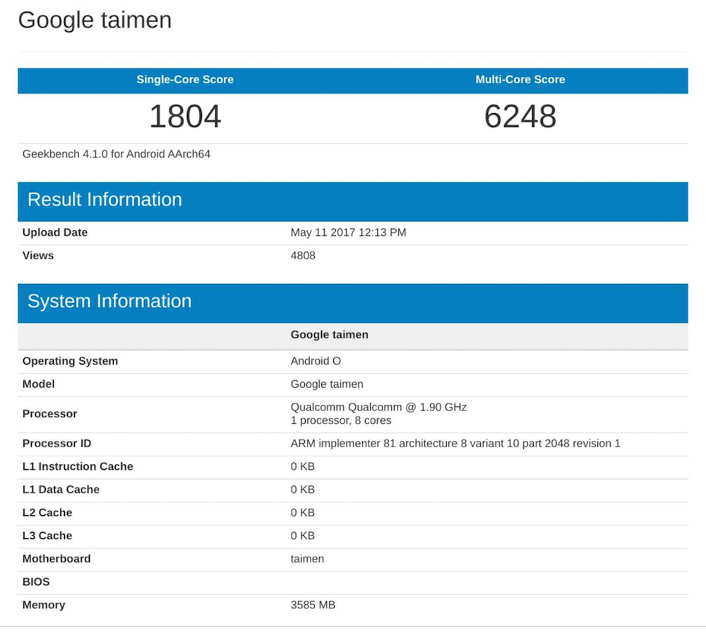 根據先前的消息來看,Google 非常有可能在今年的開發者大會上推出三款 Pixel 手機,雖然這個消息是否正確目前還沒辦法證實,但市場也不否認有這個傳聞的存在。而這次在國外知名跑分網站 Geekbench 上曝光的 Google taimen,有可能就是三款 Pixel 手機中的其中一款,這款手機除了採用 Android O 作業系統之外,還將搭載高通 Snapdragon 835 處理器與 4GB RAM,也使得這款代號為 Taimen 的 Pixel 手機跑出單核 1804 分、多核 6248 分的效能成績。